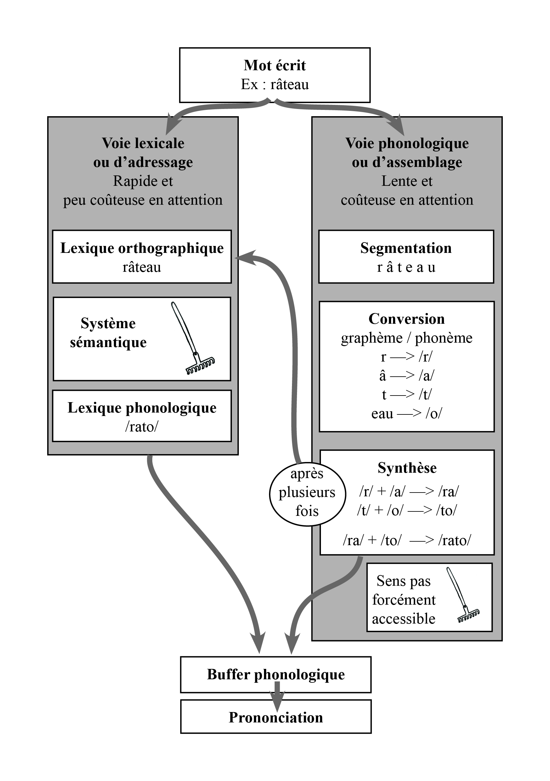 En revanche, mise à part l’analyse visuelle, la voie d’adressage (à gauche sur le schéma) implique des opérations mentales qui se passent en deçà de la conscience et qui sont donc automatisées et rapides avec un accès au sens systématique lorsque le lien signifiant - signifié existe.